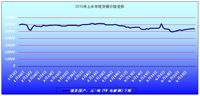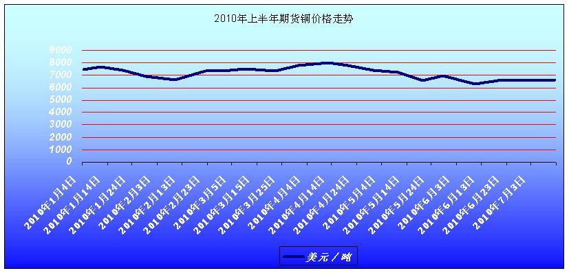 2010年上半年,铜市价格呈先扬后抑的震荡格局,不断好转的经济数据带来的复苏信息,对于通货膨胀的担忧已在持续升温,再加上央行多次上调央票利率和存款准备金率,希腊等国爆发财政危机推动美元反弹,库存压力等愈发显著的不利因素的集中爆发是的铜市疲于应付,出现了剧烈的震荡格局,紧缩的货币政策,西方国家的财政危机,美国房地产业的反复无常导致了市场的恐慌,大大打压了铜市的上涨势头。