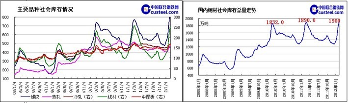 目前全国钢材社会库存持续上升,螺纹钢、线材库存保持快速上升态势,热轧卷板库存上升速度略有放缓,冷轧库存缓慢增长,中厚板库存小幅回落。截止周末,全国25个重点市场社会钢材库存总量为1899.87万吨,较上周增加50.93万吨。随着库存的快速反弹,当前社会库存总量已经超越去年3月4日的高点,创下历史新高,预计在2月底国内重点市场库存可能突破2000万吨的历史关口。