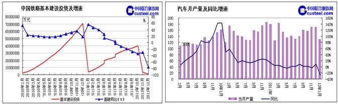 15日,铁道部官方网站发布的2012年1月全国铁路主要指标完成情况显示,1月铁路基本建设投资仅87亿元,同比减少76%;固定资产投资122亿元,同比下降69.6%。1月我国汽车产销量大幅下降,1月我国生产汽车129.94万辆,环比下降23.20%,同比下降27.47%;1月我国销售汽车138.98万辆,环比下降17.75%,同比下降26.39%。从以上数据可以看到,不仅仅是铁路与固定资产投资出现大幅回落,并且机械、汽车等行业受市场流动性收紧影响,企业融资难度增大、成本持续攀升,这些因素加大了今后全行业经营效益增长的压力。因此下游用钢行业景气度不高,对钢材的需求拉动比较有限。