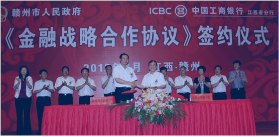 6月14日,工商银行江西省分行与赣州市人民政府在赣州正式签署了《金融战略合作协议》。此次签约是银政双方进一步加强友好合作、加快赣南苏区振兴、推进共同发展的重大战略举措。工行江西省分行党委书记、行长倪百祥;中共赣州市委副书记、赣州市人民政府市长冷新生;赣州市委常委、副市长王东伟等出席了签约仪式。