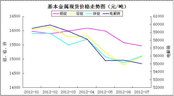7月有色金属市场整体走势相对前期低谷有所回升,月初金属市场迎来了开门红,使得其重心有小幅上移,这将为后市反弹垫下一定的基础。但是因为下游市场需求的萎靡,金属基本面也显疲弱,导致金属价格上冲乏力;且宏观面上利空消息频频来袭,欧债危机前景扑朔迷离,这成了市场挥之不去的阴影,不断增加市场悲观情绪,人气一度受挫,令金属承压,反弹动力明显不足。