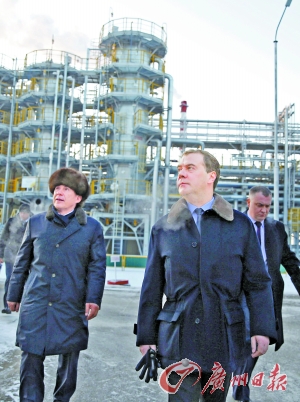 俄罗斯总理梅德韦杰夫3日视察该国一座炼油厂。