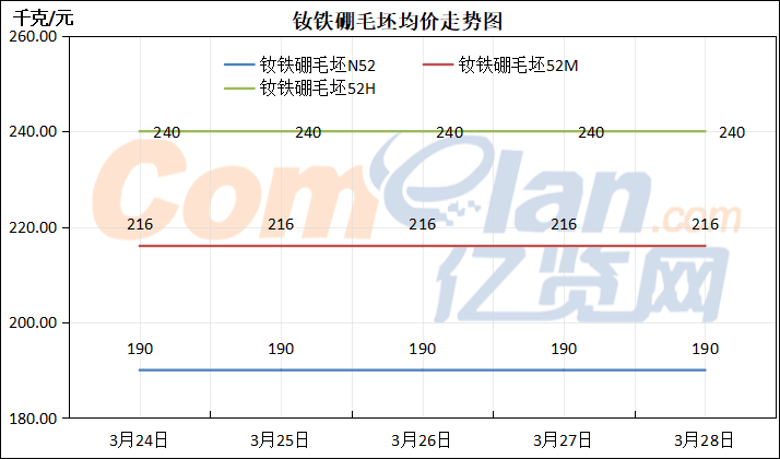 钕铁硼:钕铁硼毛坯N52报收185-195元/千克;钕铁硼毛坯52M价格报收211-221元/千克;钕铁硼毛坯52H价格报收235-245元/千克;当前,磁材企业的后续订单量有所减少,导致市场采购意愿下降,整体呈现出较为浓厚的观望情绪。钕铁硼废料价格:钕铁硼废料镨钕价格报收469-474元/公斤;钕铁硼废料镝价格报收1613-1635元/公斤;钕铁硼废料铽价格报收5232-5341元/公斤。 周内,原料端稀土金属市场偏强运行,轻稀土金属镨钕报价高位上移,镝铽金属市场涨势明显,主要受氧化物端带动为主,磁材企业高位接货能力有限,价格向下传导缓慢,铁硼市场暂稳为主,下游需求面表现平平,后市仍需密切关注上游成本端及下游订单释放情况。