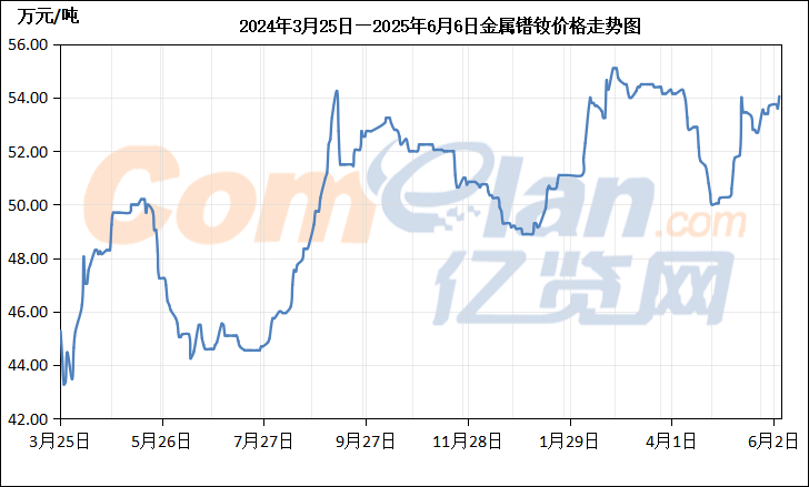 本周钬价呈现上调态势。周初钬产品价格稳中偏强,市场询单情况尚可,下游多按需采购。场内低价报价较少,商家询货时多有压价行为,贸易商参与度不高,实际成交以少量为主,当前氧化钬报价为 51.5-52 万元 / 吨。
