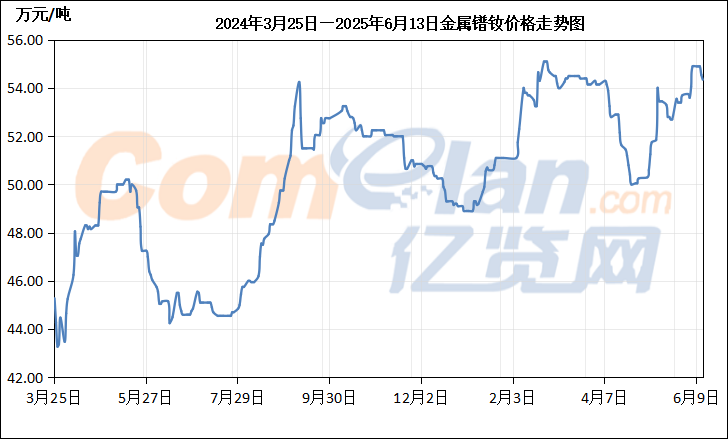 本周,镝价出现小幅回落。周初,镝的市场价格为160万元/吨,彼时市场交易氛围尚可,下游企业按需开展询单工作。但随着时间推进,整周镝价呈现震荡下行态势。由于市场现货供应充裕,而下游需求却持续萎靡,难以形成有效价格支撑,致使场内报价不断走低,实际成交价格也随之下滑。