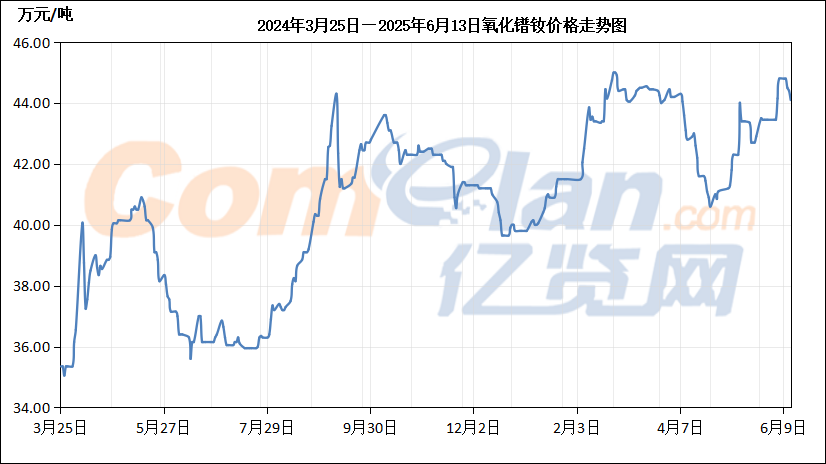 本周,镨钕价格呈现弱势下行走势。周初,市场气氛相对平稳,镨钕价格仍维持在较高水平,生产厂家报价区间为44.7-44.9万元/吨,低价出售意愿较低。然而,金属市场表现疲软,询盘热度不高,金属生产企业出货困难,这种压力逐渐向上游传导,导致氧化物价格开始下跌。贸易商出货意愿增强,市场观望情绪渐浓,下游采购方接货态度愈发谨慎,多采取压价策略进行采购。当前市场环境下,商家普遍关注中美经贸会谈后续政策的落实情况。