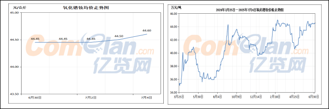 镝价偏暖运行。周初镝价稳定,市场情绪平稳,询单少量,下游订单一般,补货情绪不高,低价现货成交,贸易商变现出货;周后期集团采购镝产品,挺价情绪浓,场内低价收紧;镝铁价同步调整,终端订单一般,金属出货不多,金属厂报价坚挺,成交少量。当前氧化镝报价163-165万元/吨,镝铁158-160万元/吨。