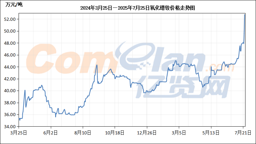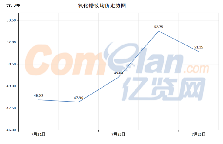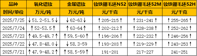 本周镨钕价格大幅上涨。氧化镨钕市场情绪坚挺,期货电子盘价格大幅拉涨,商家看涨情绪浓厚,现货报价上移,金属厂接货承压,高位成交不多,成本端支撑有力,金属镨钕报价随之上行,下游磁材企业谨慎入市,多以刚需为主,原料端涨幅过快,商家接货能力有限,当前,氧化镨钕报价51.1-51.5万元/吨,金属镨钕62-63万元/吨;氧化钕51.8-52.2万元/吨,金属钕63.5-64.5万元/吨;氧化镨52.5-53.5万元/吨,金属镨66.5-67万元/吨。