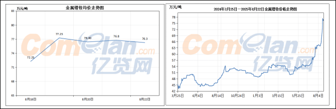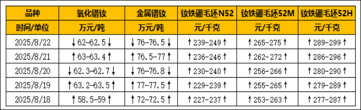需求方面,支撑力度有所好转。近期磁材企业的补货情况不错,企业生产保持稳定,8 月底的订单状况较好,对原料的采购需求依然存在。而且企业库存水平不高,终端部分订单能够接受更高的价格,磁材企业相应地提高了金属采购价格,市场对这一价格水平的整体接受度尚可。