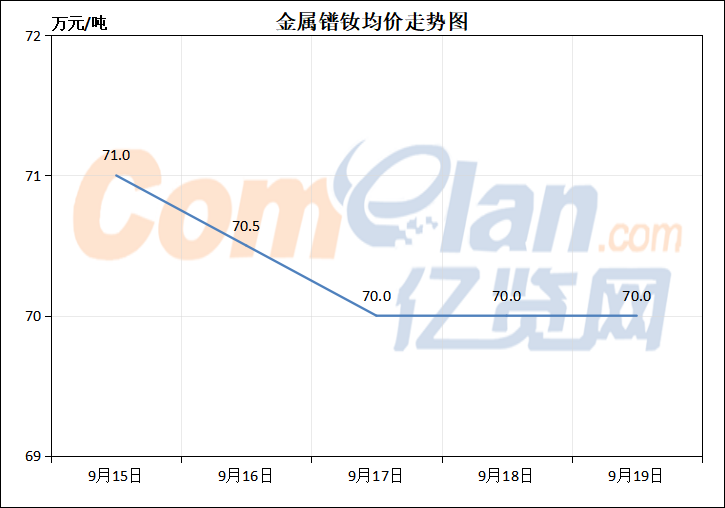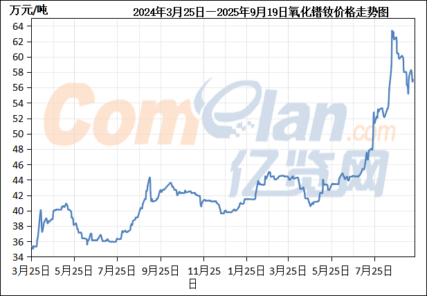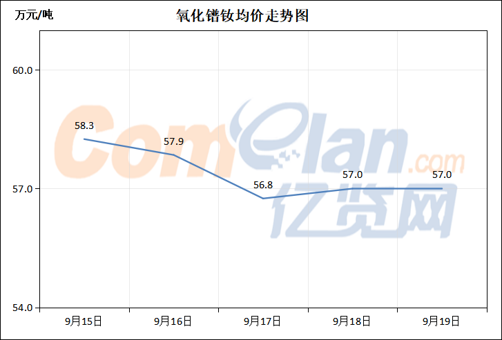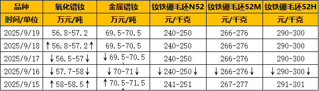 镨钕市场偏弱运行。周初,市场氛围尚可,处于国庆假期前夕,市场对市场预期增强,节前刚需备货,或带动一市场呈现上行走势,周一镨钕主流报价上涨,但下游磁材企业采购意向不高,市场反馈冷清,询单积极性不足,氧化物金属成交量不足,市场情绪转弱,镨钕报价弱势下滑直低位,氧化物报价低位在 56.8 万元/吨;临近周末,磁材大厂入市招标采购,行情有所提振,氧化物报价小幅探涨,低价现货收紧,当前,氧化镨钕报价在 57-57.5 万元/吨,金属镨钕报价在 70-71 万元/吨。氧化钕 63-64 万元/吨,金属钕 80-81 万元/吨;氧化镨 62.5-63.5 万元/吨,金属镨 79.5-80.5 万元/吨。