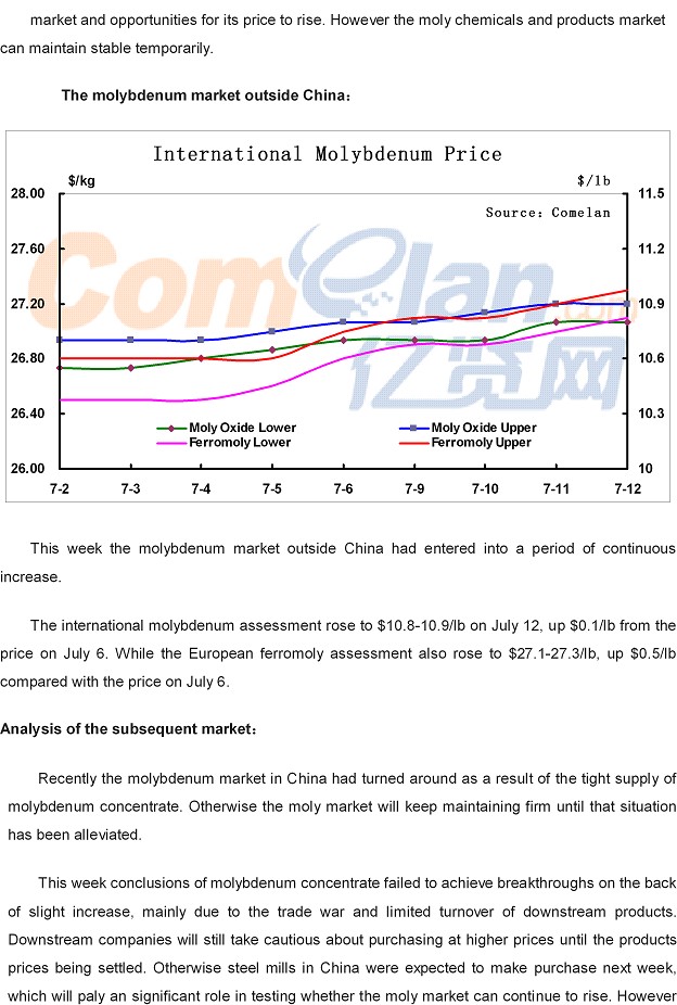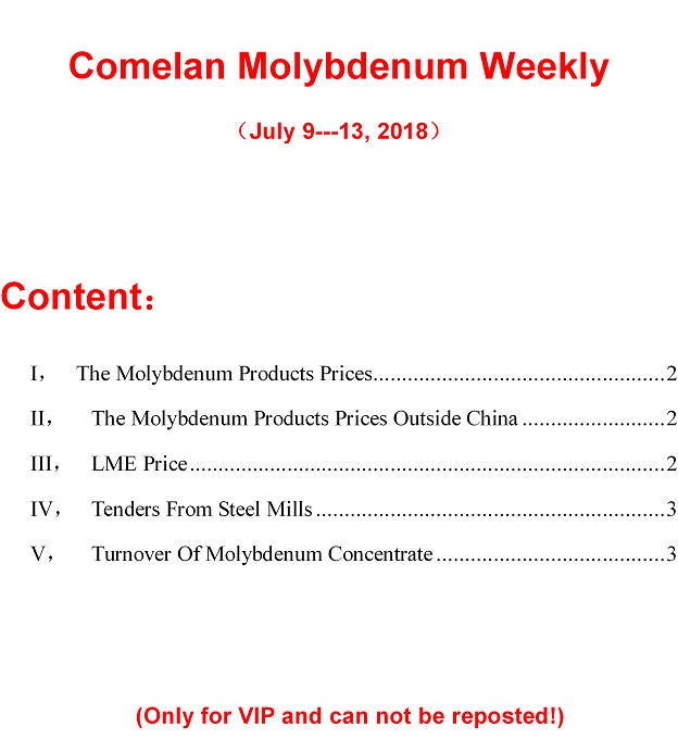 Comelan Molybdenum Weekly July 2--7, 2018