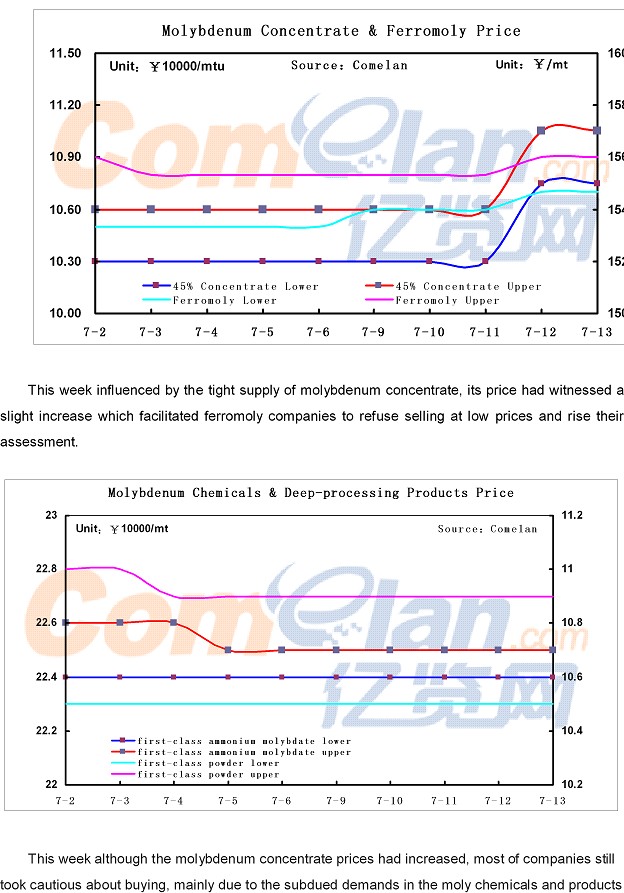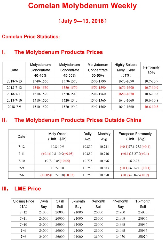 Comelan Molybdenum Weekly July 9--13, 2018