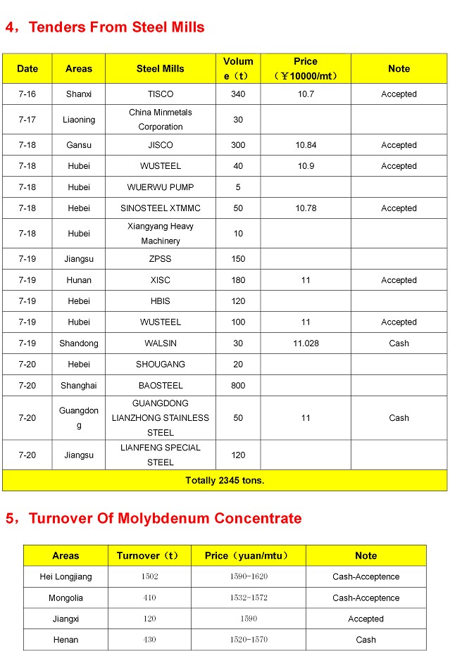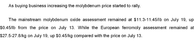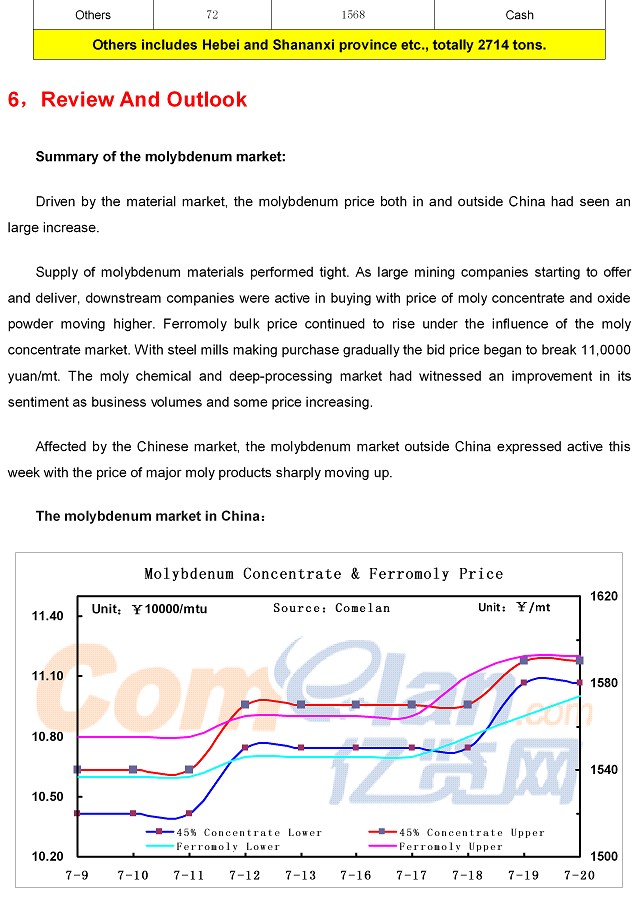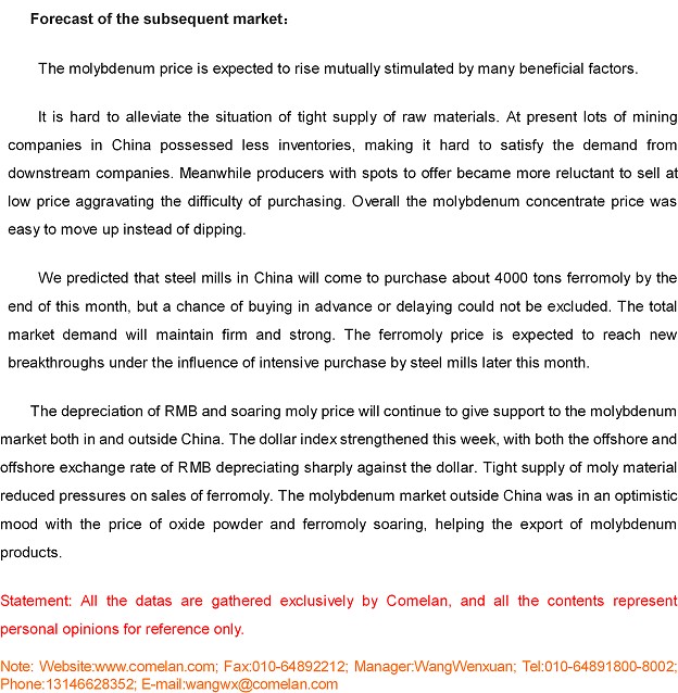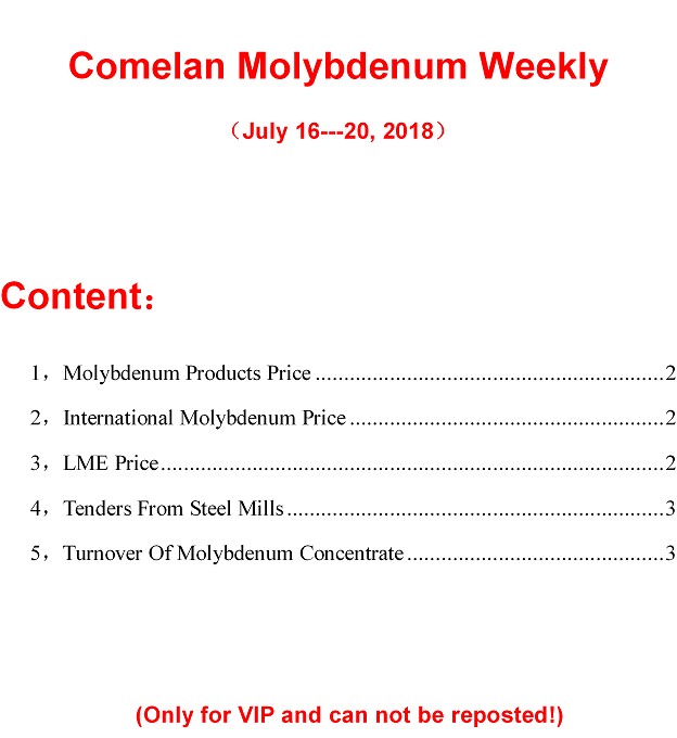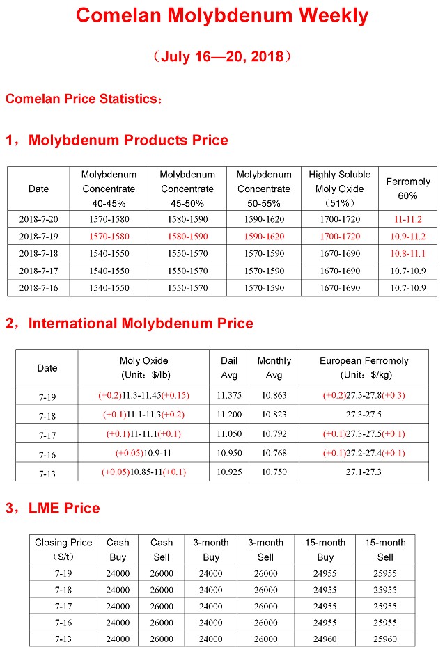 Comelan Molybdenum Weekly May 28-June1, 2018