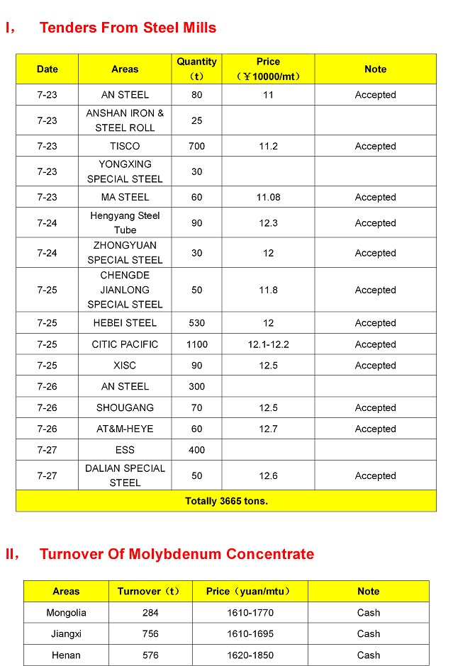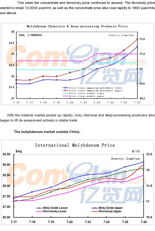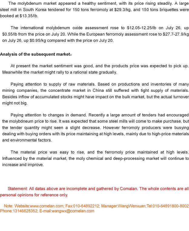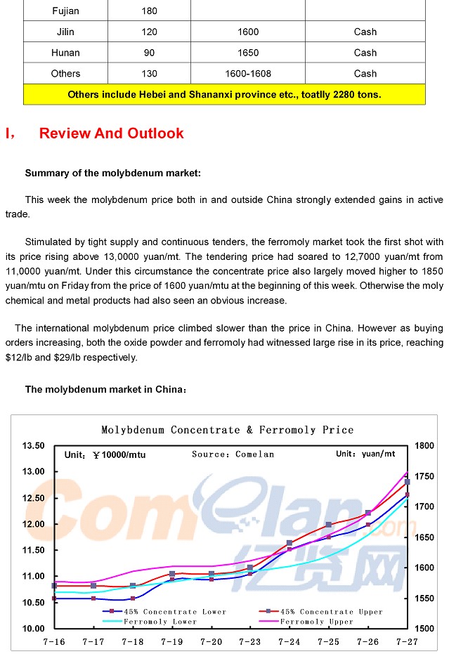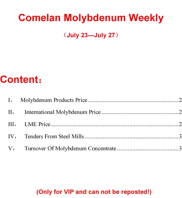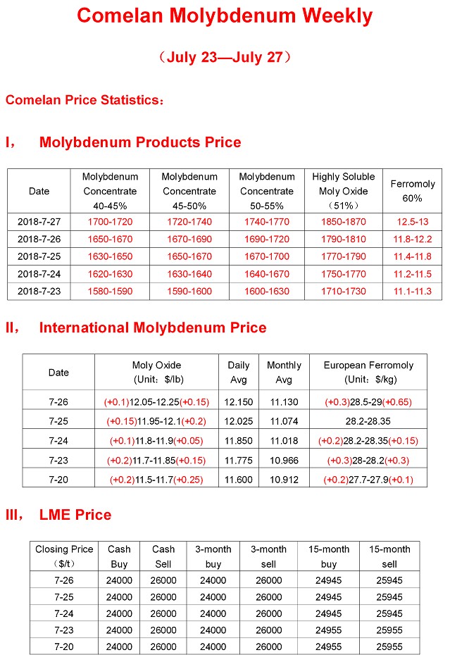 Comelan Molybdenum Weekly May 28-June1, 2018