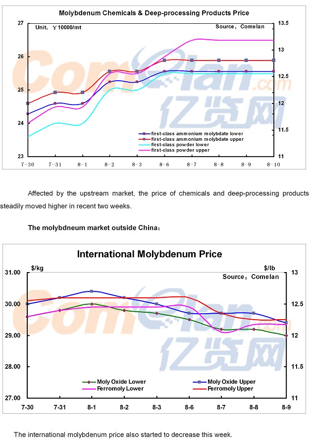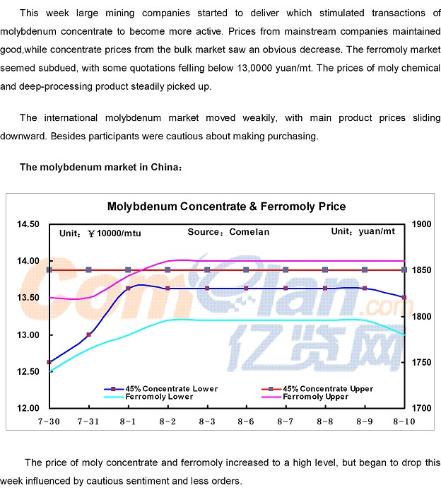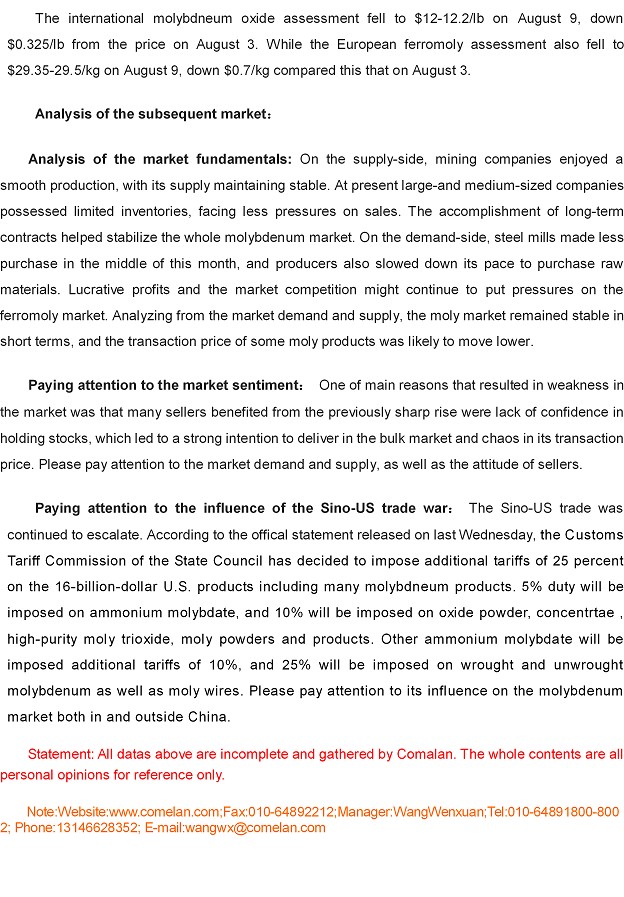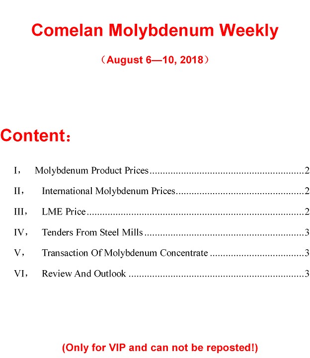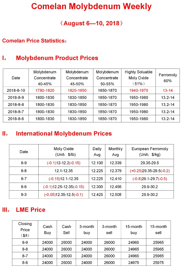 Comelan Molybdenum Weekly August 6--August 10, 2018