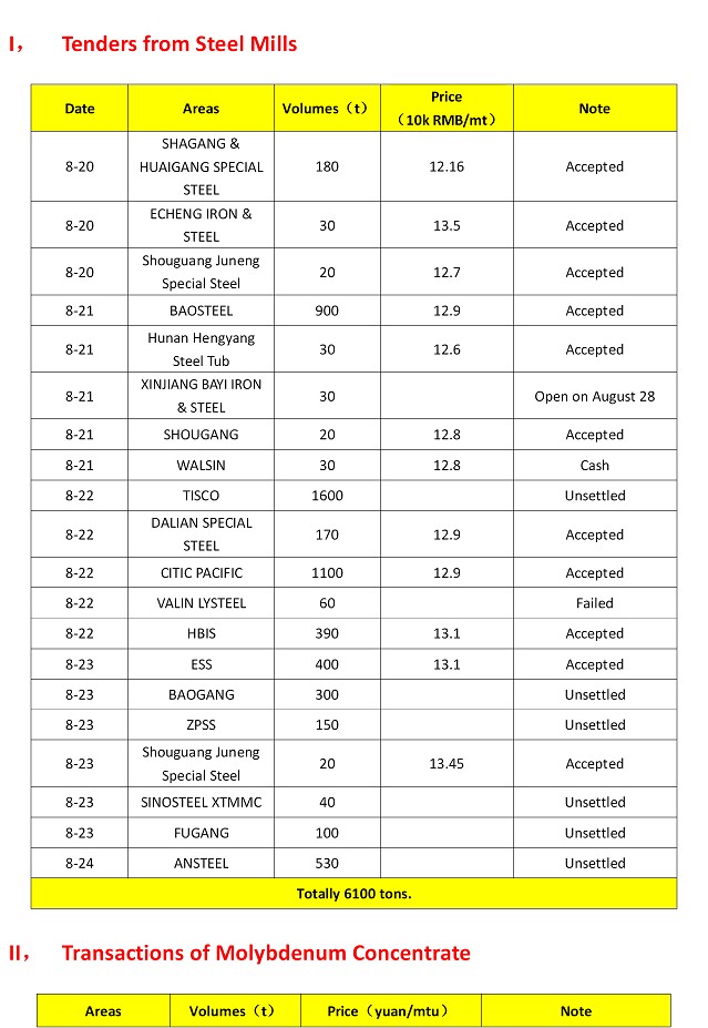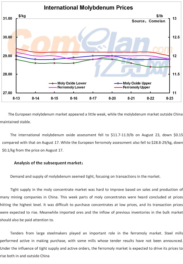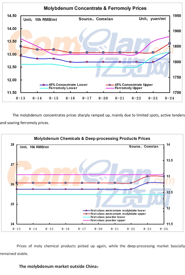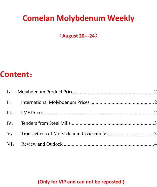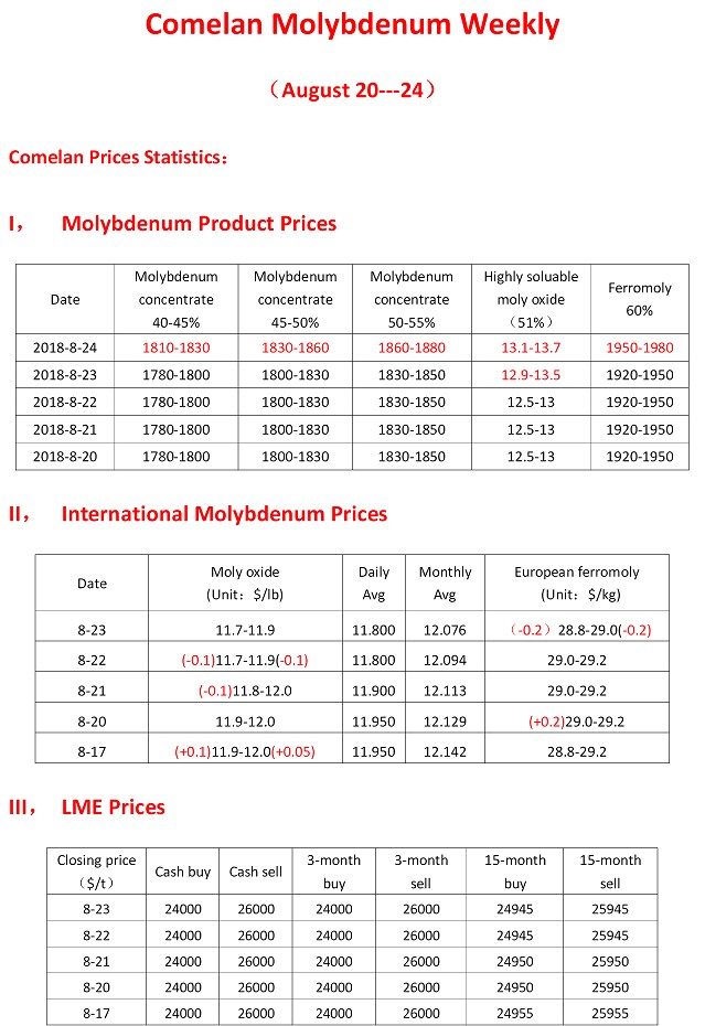Comelan Molybdenum Weekly August 20--August 24, 2018