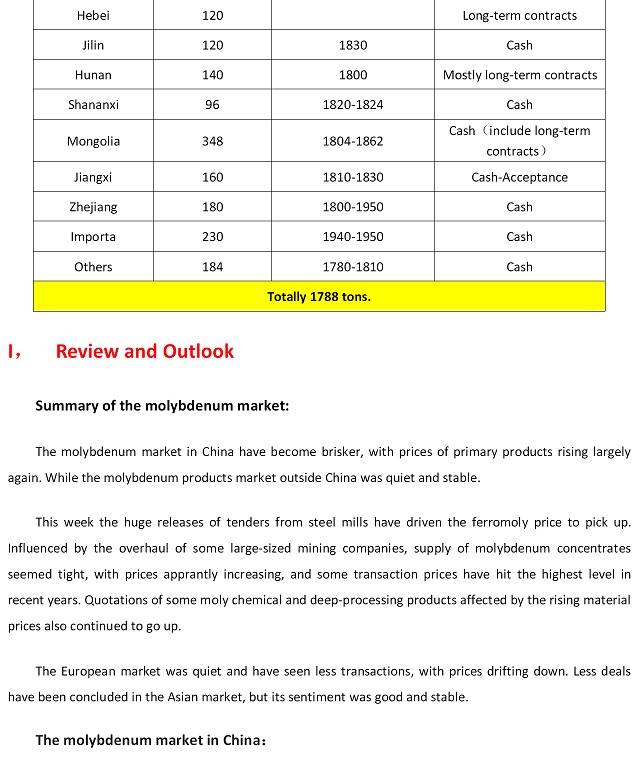 Comelan Molybdenum Weekly August 13--August 17, 2018